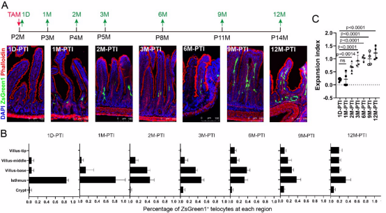 随后,为了研究这群Lmo3+ 特络细胞在小鼠出生后是否继续存在,研究人员检测了不同年龄段的小鼠肠道中Lmo3+ 特络细胞的分布情况。结果发现,在小鼠出生后,仅有肠峡部周围的Lmo3+ 特络细胞被逐渐保留下来,并在小鼠成年后于此处长期稳定存在。